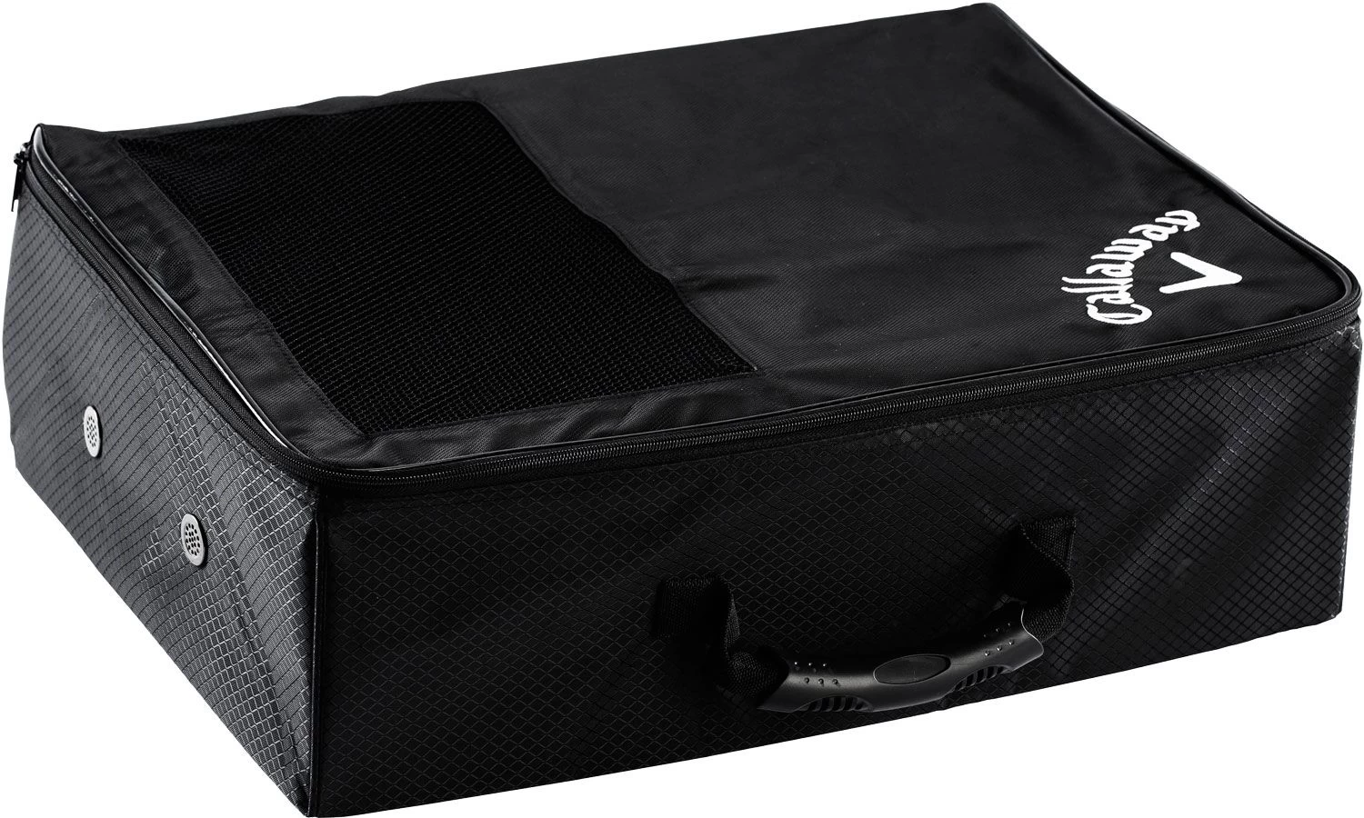 Arrange your golf gear in your trunk or golf locker with the Callaway® collapsible equipment organizer. Easy access compartments provide secure storage for shoes, hats, valuables, and other essentials for your trip to the course. Rigid wall dividers and easy-pull zippers keep your equipment separated, while mesh material allows for adequate ventilation. When not in use, the locker quickly collapses flat for fast and easy storage.